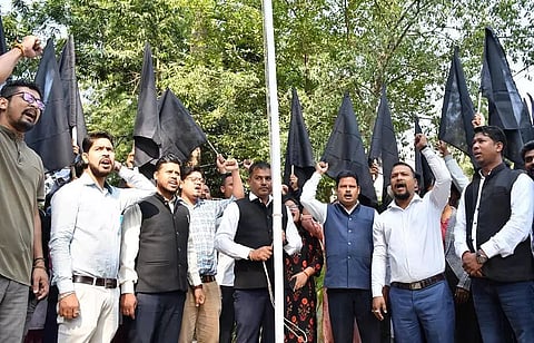 The agitators hoisted a black flag at the AJP headquarters as a mark of protest against the passing of the 'contentious' Citizenship (Amendment) Bill by the Parliament two years ago on December 11, 2019.