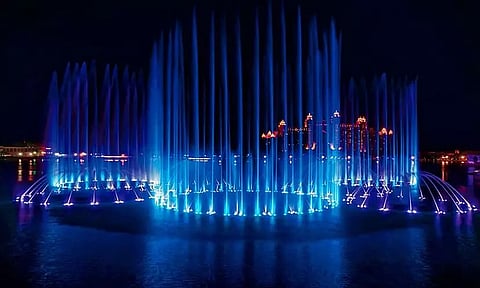 The Palm Fountain spread over 14,000 square feet of seawater, is located at The Pointe shopping and dining district on Palm Jumeirah, a man-made palm-shaped island. Equipped with 3,000 LED lights and 7,500 nozzles, the fountain can shoot water up to 105 metres.