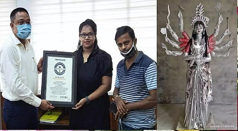 SILCHAR: The story is of a Karimganj girl Pollabi Deb Roy who sets world record in making idol of Durga in her own concept and artistic design with a difference. She made the largest statue of Goddess Durga by recycling products. The size of the idol was 6 ft. She used plastic packets, spoons, aluminium sheets, cardboards and clay model to make the idol and achieve the feat. It was in 2018 that Pollabi made the idol which was a matter of appreciation in social media. It was after two years that her work of art got a place in International Book of Records.