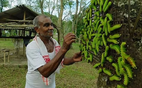While visiting his Muga rearing place (chomani), Pramod Dutta said, "We have been rearing Muga silkworms on 550 Chom trees (Persea bombycina) during the current season. This year the larvae have grown up well. They have started to become pupa at present. We expect that we will harvest more than a lakh of Muga coocoons from this batch." The retired teacher has gained public appreciation by setting an example of diligence even after his retirement and for paving way for earning livelihood for at least three families while overcoming the situational odds.