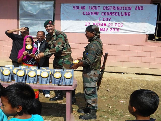Silchar, May 14: 37 Assam Rifles distributed solar lamps to the villagers of Namdailong, under Jirighat Police Station on Sunday. Namdailong village is one of the most populated in the border areas of Jiribam and Assam with an approximate population of more than 1000 people. There is still no electricity supply in the village and hence keeping in mind the discomfort of the villagers, the lamps were distributed by the Assam Rifles. A rational view was taken during the distribution of the lamps, wherein emphasis was laid on the families whose kids are studying in senior classes or the houses which are remotely located. Assam Rifles officials visited each and every house of the village before short listing the families for the distribution.