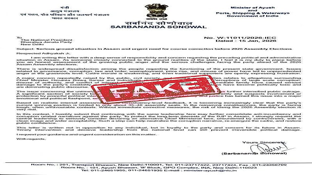 "It has come to our notice that a forged letter bearing the official letterhead and fake signature of Union Minister Sarbananda Sonowal is being circulated by miscreants with malafide intent. This constitutes a serious criminal offence involving forgery, impersonation, and misuse of official government identity, apparently aimed at spreading misinformation and discrediting a constitutional authority," the statement said.