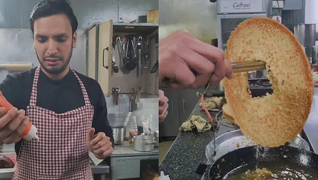 For the uninitiated, ghewar is a disc-shaped Mithai (sweet) with a crisp, honeycomb-like texture, infused with sugar syrup and often served with cool, creamy rabri. In the video, Sharma begins by heating a pan to boiling, drizzling in sugar syrup, and stirring until bubbles form. As the sugar mixture crisps up, it hollows in the centre and solidifies into a golden-brown disc. The dessert emerges with a crunchy exterior and soft, bread-like interior—classic ghewar perfection.