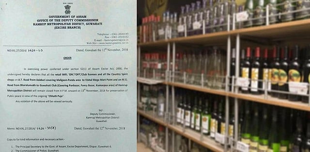 Guwahati: To ensure public peace and maintain law and order condition in the city during the Chhath Puja, The Kamrup District Administration in a circular notice ordered that all the retail IMFL ON/OF/ Club licenses and all the country spirit shops on AT Road from Adabari covering Maligaon-Pandu area to Vishal Mega Mart point and on M.G.Road from Bharalumukh to Guwahati Club (covering Panbazar, Fancy Bazar and Kumarpara area) of Kamrup Metropolitan district will remain closed from 4 pm onwards on November 13.