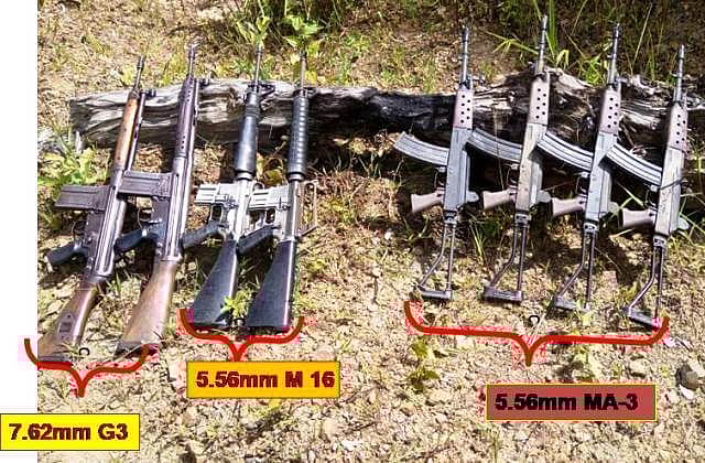 In the ensuing chase, the suspects abandoned their motorcycle and gunny bag and crossed Tyao river which marks the international boundary and fled into Myanmar. Search of the gunny bag led to the recovery of two US origin 5.56 mm M-16 rifles, two German origin 7.62 mm G-3 rifles and four Myanmar origin 5.56 mm MA3 assault rifle.