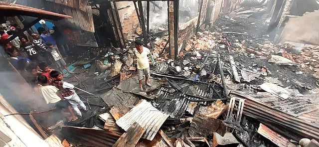 GUWAHATI: Eleven shops were gutted at Railway Bazar in the Pandu area in Guwahati on Saturday night when a fire broke out. The reason of the fire is not known. Twelve fire tenders were pressed into service to douse the fire.