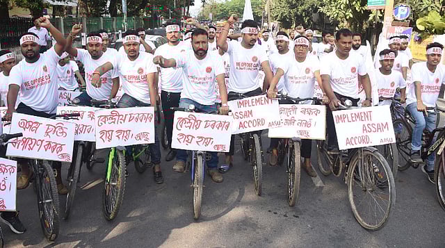 GUWAHATI: The All Guwahati Students’ Union (AGSU) took out cycle rally in the city to protest against CAB. The AGSU took out the protest opposing CAB as a part of the protest going on around the state as per the appeal by All Assam Students’ Union and 30 Ethnic Students’ organizations. The rally started from Shahid Nyas via Chandmari, Ganeshguri, Bhagaghar and Ulubari. Showing their resentment with anti-BJP slogans the protesters also opposed AGP’s current role regarding the citizenship amendment bill. Taking part in the rally one the protester said that we’re opposing the CAB and we appeal every citizen to oppose it, we’ll continue our protest until the central government scrap CAB. Another protester said that the rally has only objective that AASU will never agree to the citizenship amendment bill.