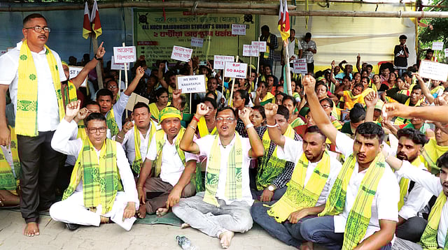 Guwahati: The All Koch-Rajbongshi Students’ Union (AKRSU) on Tuesday staged a protest at Chachal in Guwahati, condemning Bodoland Territorial Region (BTR) Chief Executive Member (CEM) Pramod Boro over his alleged remarks on the Koch-Rajbongshi community’s demand for Scheduled Tribe (ST) status.