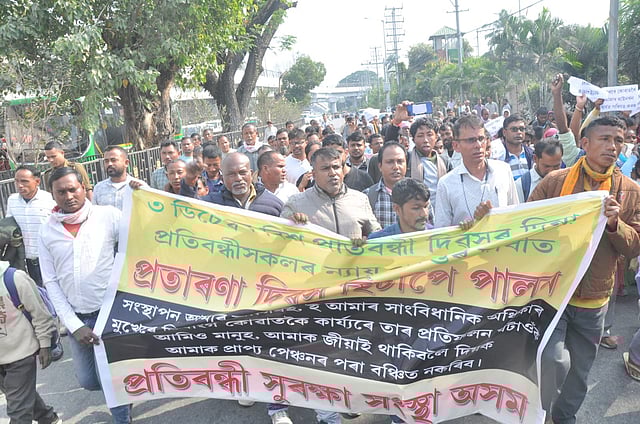 Hundreds of protestors under the banner of Pratibandhi Suraksha Sangstha, Assam (PSSA) on Wednesday observed World Disability Day and marched from Supermarket, breaking through several layers of security before reaching Janata Bhawan while chanting slogans. Despite police attempts to stop them near the flyover, the demonstrators pushed past barricades and occupied a key stretch of GS Road, staging a sit-in at the CM’s residence entrance.