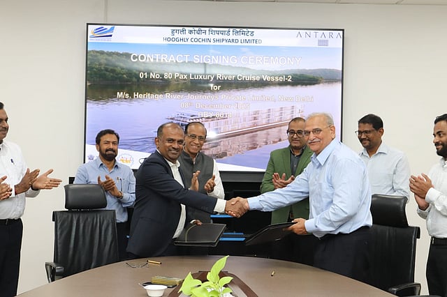 The agreement was formally signed by Raj Singh, Chairman and Managing Director of Antara Cruises, and Sreejith K. Narayanan, Chief Executive Officer of Hooghly Cochin Shipyard Limited, in the presence of senior officials from Cochin Shipyard Limited and Heritage River Journeys Pvt. Ltd.