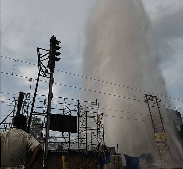 The incident occurred barely 10 minutes before this report, when water began gushing out at extremely high pressure. Eyewitnesses said the burst sent water shooting up to nearly 70–80 feet, splashing across the rooftops of three- to four-storey buildings nearby.