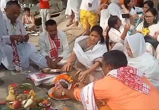 The religious ceremonies, including the Pinda Daan, were performed by the head priest of the Aswaklanta Temple — one of Assam's most revered shrines, situated on the banks of the Brahmaputra.