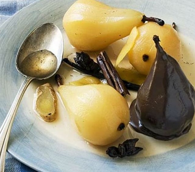 - Use a draining spoon to transfer the pears to a dish. Strain the strup into a small saucepanand boil until it is reduced to about 3 tablespoons. Spoon it over so the pears and allow to cool,then chill for 2 hours
