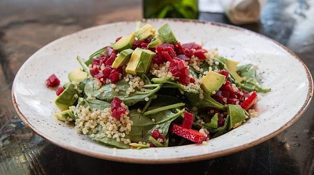 Soak barley overnight and cook next morning till soft but not mushy, strain and refrigerate. Set baby beats to soft stage and, cool and cut into thin slices. Bring water to boil add salt and Quinoa turn off the heat cover with lid and leave for 20 mins, strain and chill. Toss quinoa, sliced apple, diced beets and barley lightly with vinaigrette and arrange on a plate. Dice the gorgonzola cheese and arrange on top of salad. Sprinkle moringa powder and garnish with microgreens or cilantro.