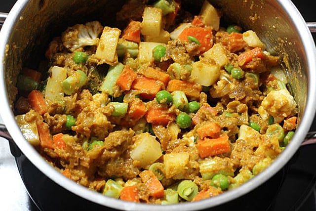 * Stir in the salt, vegetables with all their cooking liquid, the blended cashew mixture and the remaining milk.