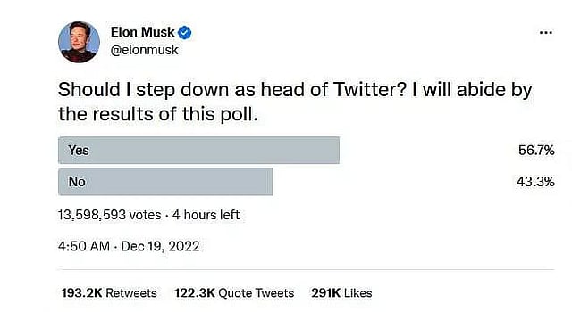 Elon Musk put out a vote about his position on the popular microblogging site with the mention that he will abide by the mandate of the majority of the voters. The poll was created to take votes for 12 hours. With about four hours remaining in his vote, 56.7 percent of the voters want him to step down from the position while 43.3 percent want him to continue. A total of 13598593 votes were received in this poll at the time of writing.