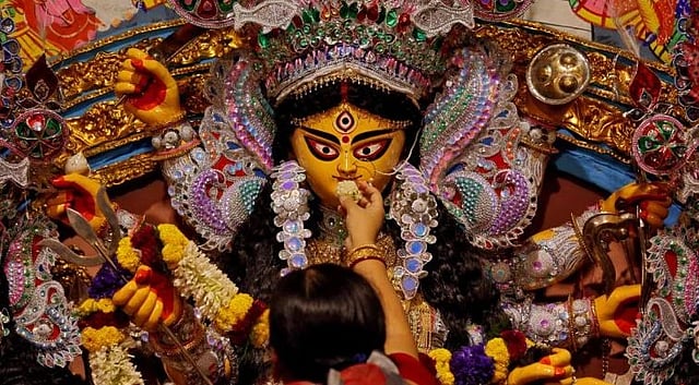 The Durga Puja is a single phrase enveloping many meanings, metaphors, memories, emotions, and also responsibilities. A consort of Lord Shiva and an epitome of female Shakti, Maa Durga has been mentioned in the Vedas, the Puranas, the Epics and a variety of other religious texts. The Goddess comes on a visit every year for four days and is accompanied by her children – daughters Laxmi and Saraswati, and sons Kartik and Ganesha. The puja that we celebrate in autumn is called ‘Okal-bodhan’, which means, ‘untimely invocation’. It is believed that the Goddess is generally offered prayers in spring, and She usually sleeps during this time of the year. However, as the legend goes, Lord Ram invoked the Goddess in autumn to seek Her blessings in his fight to free his better half, Goddess Sita, from Ravan, who was himself a devotee of Goddesss Durga. While performing the puja, Ram noticed that one of the hundred and eight lotuses required for the ceremony was missing, and he decided to offer one of his eyes as offering. Appeased by his devotion and bhakti, Maa Durga appeared before him, and with Her blessings and aid, Ram won the battle of Lanka.