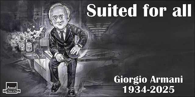 Indian dairy brand Amul paid a special tribute to legendary designer Giorgio Armani, who passed away at the age of 91 on Thursday. A caricature-style illustration celebrated Giorgio Armani’s legacy with the text “Suited for all” written on it.