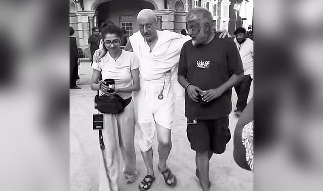 On Sunday, the senior actor took to his Instagram, and shared a monochromatic video from the sets of the film. The BTS video shows him walking with his arms around the neck of director Vivek Ranjan Agnihotri and an assistant director.