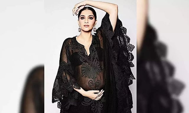 Bollywood actress Sonam Kapoor has finally shared a glimpse of her baby bump in style. The actress shared a motley of pictures, where she is seen wearing a black see-through embroidered kaftan.In one image, she is seen lovingly holding her blooming baby bump with one hand and placing the other on her head. The tagged hubby Anand Ahuja, mom Sunita Kapoor, and sister Rhea Kapoor.