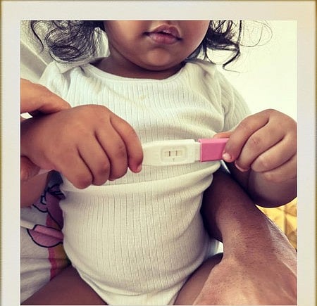 She took to her official Instagram handle and published a cute pic of her daughter Dua holding a positive pregnancy test.