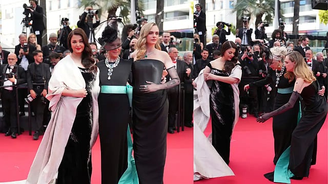 Before the trio posed together, here’s what happened. Cara and Helen gave a helping hand to Aishwarya and tried to fix her dress. Aishwarya handled a minor wardrobe mishap with elegance and grace. Mirren accidentally stepped on Aishwarya’s flowing cape and the cape slipped down to Aishwarya’s elbows. The photo session was interrupted. Aishwarya adjusted the cape with a smile and also spoke to Mirren who apologized. Aishwarya Rai Bachchan is the ultimate muse of the photographers as she served old Hollywood vibes. The actress ditched her usual sleek hair and opted for soft, side-swept waves. She also upped her style game with bold red lips and statement earrings. (Agencies)