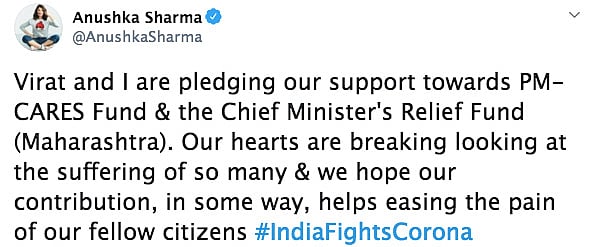 NEW DELHI: Indian cricket captain Virat Kohli and Bollywood star Anushka Sharma has pledged support towards relief fund for helping India fight coronavirus pandemic.