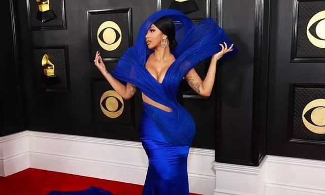 American rapper Cardi B arrived wearing Indian designer Gaurav Gupta's surreal, sculpture-like couture in cobalt blue colour at the 2023 Grammy Awards. Looking every bit stunning in a gown, which featured pleated structural features, headgear, a sleek skirt and a dramatic train, the rapper made heads turn on the red carpet.