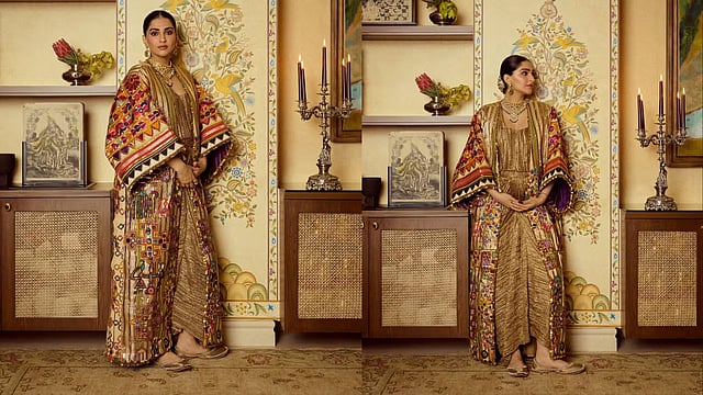 Flaunting her baby bump in a chic ensemble, the actress radiated grace and confidence, giving a glimpse of her radiant maternity glow. On Friday, Sonam, who is pregnant with her second child, took to her Instagram handle and shared a couple of her stylish photos. In the images, the ‘Neerja’ star can be seen wearing a chic golden outfit paired with a multicoloured shrug. She completed her look with a heavy golden neckpiece and matching earrings.