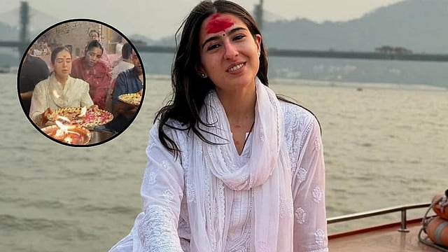 Actress Sara Ali Khan participated in the Ganga Aarti at Varanasi's Dashashwamedh Ghat on Saturday. The 'Kedarnath' actress was seen worshipping Mother Ganga amidst the sounds of bells and drums, and the chanting of mantras.