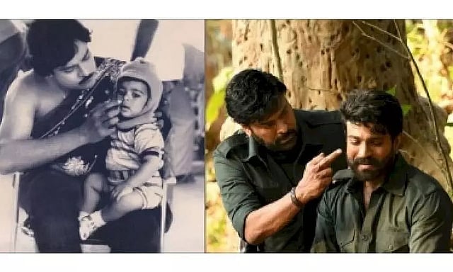 The picture shared by Chiranjeevi has a collage in which the little Ram Charan is seen with his father on the sets of an old movie, and the latest shot from the father-son duo's upcoming movie 'Acharya'. Chiranjeevi has shared these pictures, as the duo has given similar poses in two different pictures, decades apart.