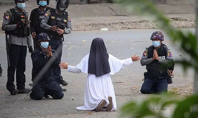 The incident took place in the town of Myitkyina in northern Myanmar on Monday. Images and videos have surfaced on social media that has gone viral. The nun was praised by many and was called as an epitome of courage.