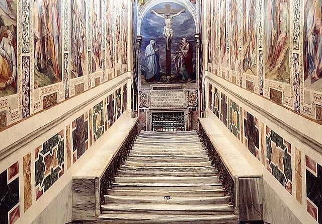 Drops of Jesus’ blood that are said to have fallen on the steps are marked by medieval crosses in three places on the stairs. Tourists stop to kiss and touch them as they make their way up the 28 marble steps on their knees. Although there is no written documentation, tradition has it that Emperor Constantine’s Mother, Helen, an avid collector of relics of Jesus in the 4th century, had the stairs brought over from Jerusalem. “The Gospel of John recounts that Jesus went up these stairs several times,” said Father Francesco Guerra, Rector of the Holy Stairs.