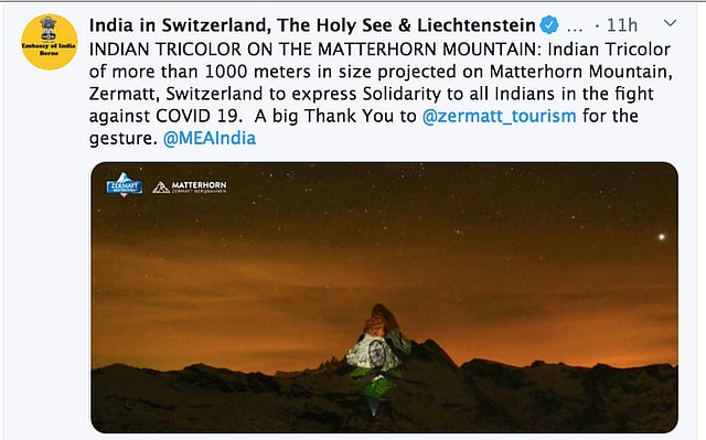 Switzerland’s 14,692-foot mountain Matterhorn was lit up with the Indian flag. This was part of a series organised by renowned Swiss light artist Gerry Hofstetter to show solidarity in a world affected by COVID-19.