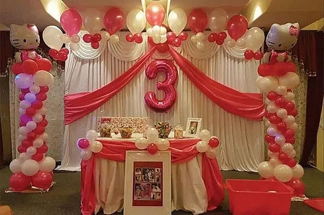 If your child is an art and paints lover, then this decoration will just be apt for your kid. A colorful bunch of balloons hanged on the ceiling and this patterned mat on the table is just working well for a grand celebration.