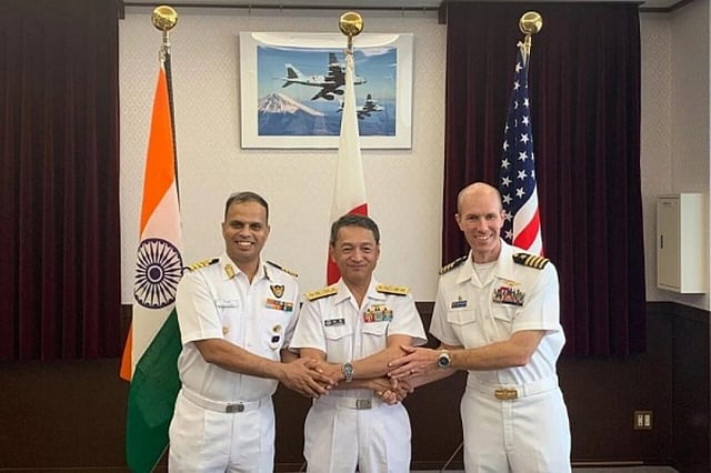 New Delhi: India, the US, and Japan on Thursday began the ‘Malabar 2019’ trilateral maritime exercise in the Pacific Ocean. The Malabar 2019 exercise, in which the Indian Navy has deployed two ships, will end on October 4. Defence sources said two frontline indigenously developed ships — INS Sahyadri, INS Kiltan —have been deployed for the exercise. Sahyadri is a multi-purpose guided-missile frigate while the Kiltan is an anti-submarine warfare corvette. The Indian Navy’s Rear Admiral Suraj Berry, Flag Officer Commanding Eastern Fleet, led the ships to Sasebo, Japan, where the exercise will be conducted. (IANS)