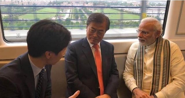 New Delhi, July 9: Prime Minister Narendra Modi on Monday travelled in the Delhi Metro along with visiting South Korea President Moon Jae-in. The dignitaries boarded a train on the Blue Line route connecting Dwarka to Noida City Centre around 4.30 p.m. at the Mandi House station and alighted at the Botanical Garden station around 5 p.m. Modi and the South Korean President were on way to the Samsung Electronics facility in Noida, where Union External Affairs Minister Sushma Swaraj was scheduled to join them. (IANS)