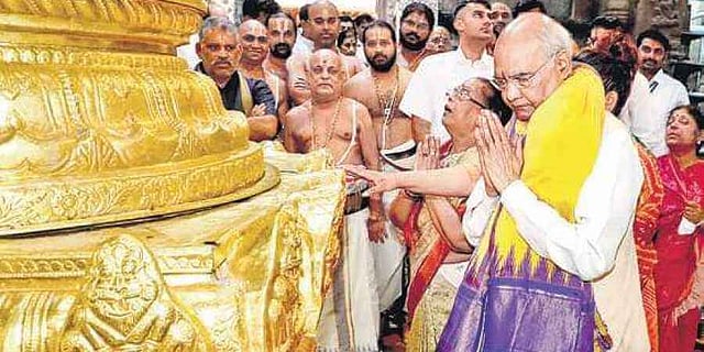 Tirupati: President Ram Nath Kovind offered prayers at temple of Lord Venkateswara atop Tirumala on Sunday. Accompanied by wife Savita Kovind and daughter Swati, the President had the ‘darshan’ at the famous hill shrine. Kovind, on a two-day visit to Tirumala, followed the temple tradition by first offering prayers at Sri Bhu Varaha Swamy temple and later the Tirumala temple. He was greeted by Andhra Pradesh and Telangana Governor E.S.L. Narasimhan who accompanied him during the ‘darshan’. The temple priests offered the President traditional ‘Isthikaphal’ welcome amid the chanting of Vedic mantras. Venugopala Dikshitulu, one of the chief priests of the temple, explained to the President the significance of the presiding deity and the importance of jewels adorned to the ‘Mula Virat’, said TTD. Later at Ranganayakula Mandapam, ‘Vedasirvachanam’ was rendered to the President and his family. (IANS)