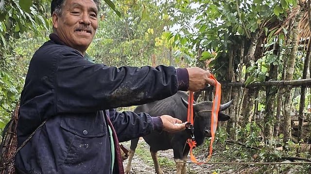 Niyang Pertin, circle officer of Pangin in Siang district, and PWD (Highways) Pasighat division executive engineer Okep Dai, on Friday distributed fluorescent collars to mithun owners. The collars are designed to make the animals more visible on highways, especially during the dense winter fog, when low visibility has led to numerous tragic accidents.