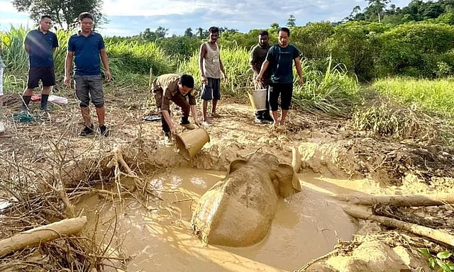 With their combined efforts, the baby elephant was successfully pulled out of the pit, believed to be a well, and was later guided back safely into the nearby forest.