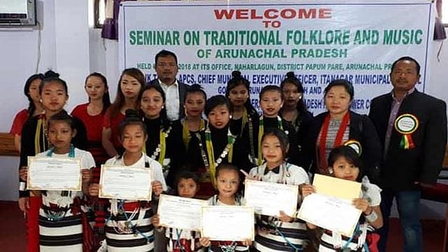NAHARLAGUN: A one day Seminar on Traditional Folk Art and Culture of Arunachal Pradesh was organized by an NGO Changkiu Bagang VFMC, sponsored by the S&F Section Ministry of culture Govt. of India, New Delhi at A T School, Tarajuli on Monday. The seminar was attended by former Zilla Parishad Member (ZPM) of Sawa from East Kameng District, Khya Choya who has great experience and knowledge in the field of folk art and indigenous culture and Principal A.T. School Sinus Minj as Chief Guest and Guest of Honor respectively. The programme imparted training on traditional folk art, music and theatre to the students of Primary and Middle schools of the Tarajuli area.