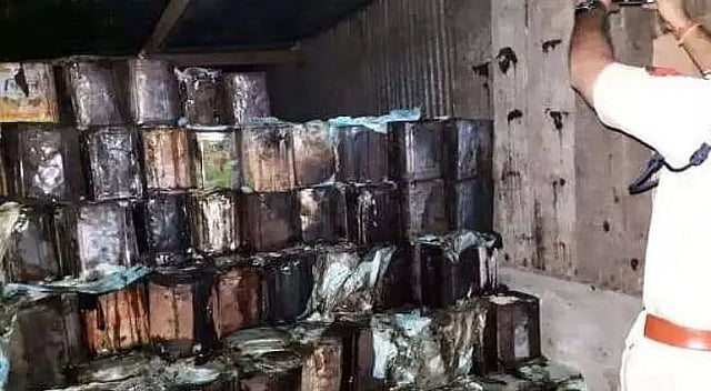 Naharkatia: Based on information, a Police team lead by Namrup DSP Kula Pradip Bhattacharjee and Officer-in-charge Naharkatia PS Bhaskar Saikia in presence of Circle Officer Naharkatia Revenue Circle Bikram Chetry conducted a search at a Grocery shop and the Godown of a well known businessman of Naharkatia namely Prasanna Bharatia and recovered around 2000 tins of suspected Lali Gur (Molasses) from the spot.