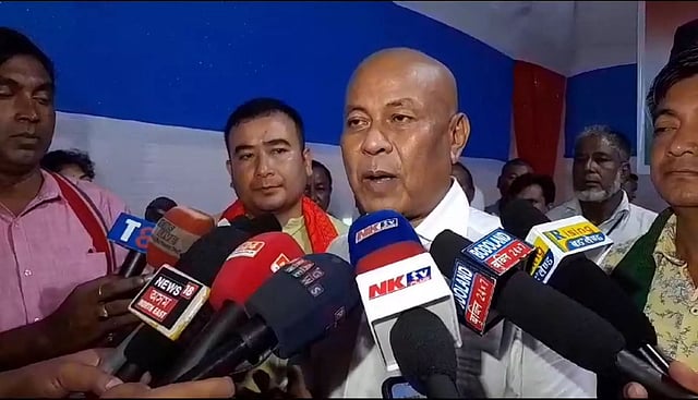 Photo: BPF president Hagrama Mohilary talking to media persons in Kokrajhar on Thursday. Sentinel.