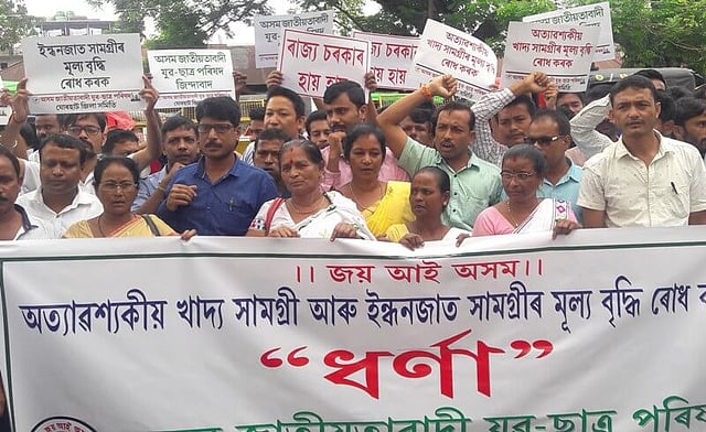JORHAT: Asom Jatiyatadadi Yuva Chatra Parishad (AJYCP) Jorhat unit activists protested against the soaring prices of essential commodities, including increasing petrol and diesel prices.
