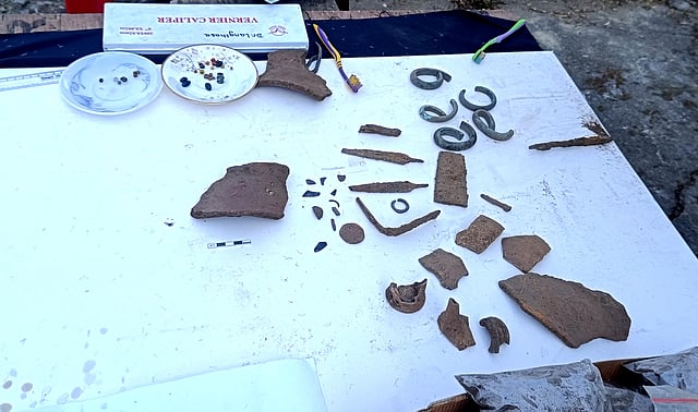 The excavation revealed a variety of objects, including handmade potsherds, wheel-made pottery fragments, metal implements such as a dao and arrowhead, bangles, ornaments, a probable spearhead, charcoal remains, bone fragments, and beads. The discoveries were made at a newly identified stone jar site in the village.