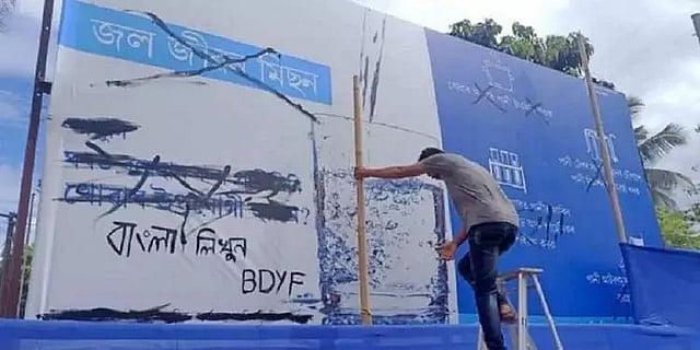 Pictures circulating in social media showed that the youth organisation wrote: "Bangla Likhun" (write-in Bengali) and the names of the two organisations below it.