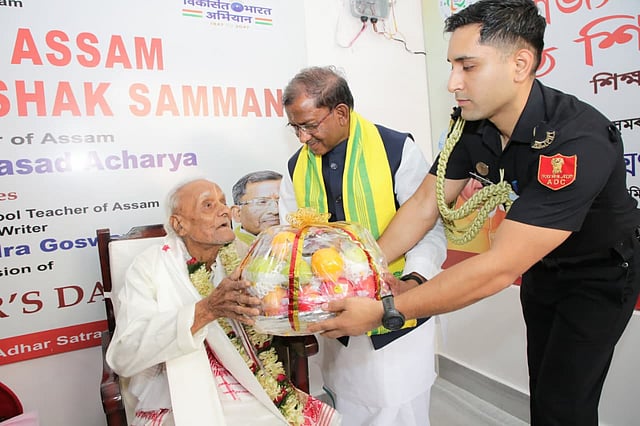 Guwahati: On the auspicious occasion of Teachers’ Day, Governor Lakshman Prasad Acharya felicitated Rajat Chandra Goswami, a 94-year-old primary school teacher who is also the oldest surviving retired primary school teacher of the state, at his residence at Adhar Satra, Hatigarh in Jorhat on Friday.