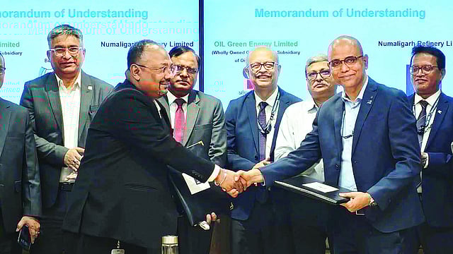 BOKAKHAT: The Numaligarh Refinery Limited (NRL) has taken a significant step towards a sustainable energy transition by signing a Memorandum of Understanding (MoU) with Oil Green Energy Limited (OGEL) on Monday. OGEL is a wholly owned subsidiary of Oil India Limited. The MoU was signed by Rupam Kumar Sarma, General Manager (Technical Services), NRL, and Rajeev Kumar Tamuli, General Manager, OGEL. The primary objective of this agreement is to collaborate on the development, procurement, and supply of renewable energy, ensuring adequate availability of green energy for NRL in the future.