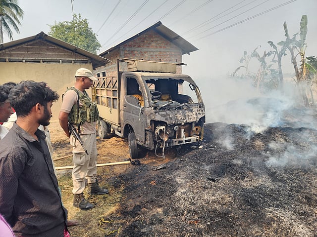 DHEKIAJULI: A devastating fire engulfed two straw-laden trucks in Bheluguri village, under Orang police station in Udalguri district, around 9:30 am on Thursday. The blaze, triggered by contact with an overhead 11,000-volt high-tension electric line, rapidly consumed the vehicles and their entire load of straw, resulting in property losses estimated at nearly Rs 15 lakh.
