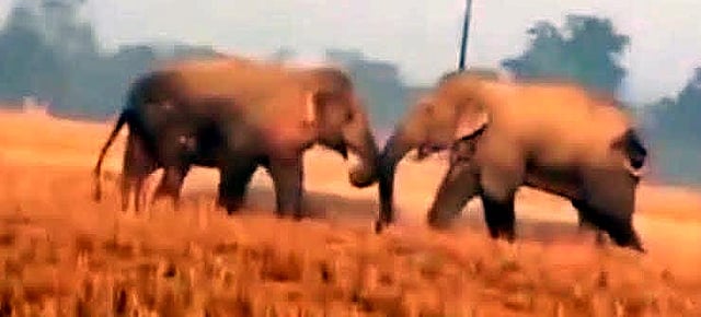 A large herd of wild elephants was roaming in a paddy field of Pankiyal village. From among them, two wild elephants became engaged in a violent fight in the morning. For a long time, the two elephants continued battling each other. On one side, crops were being destroyed as they fed on the paddy, while on the other, farmers were forced to intervene to break up the fight. After being chased for a long time by the farmers, the two elephants finally moved away.